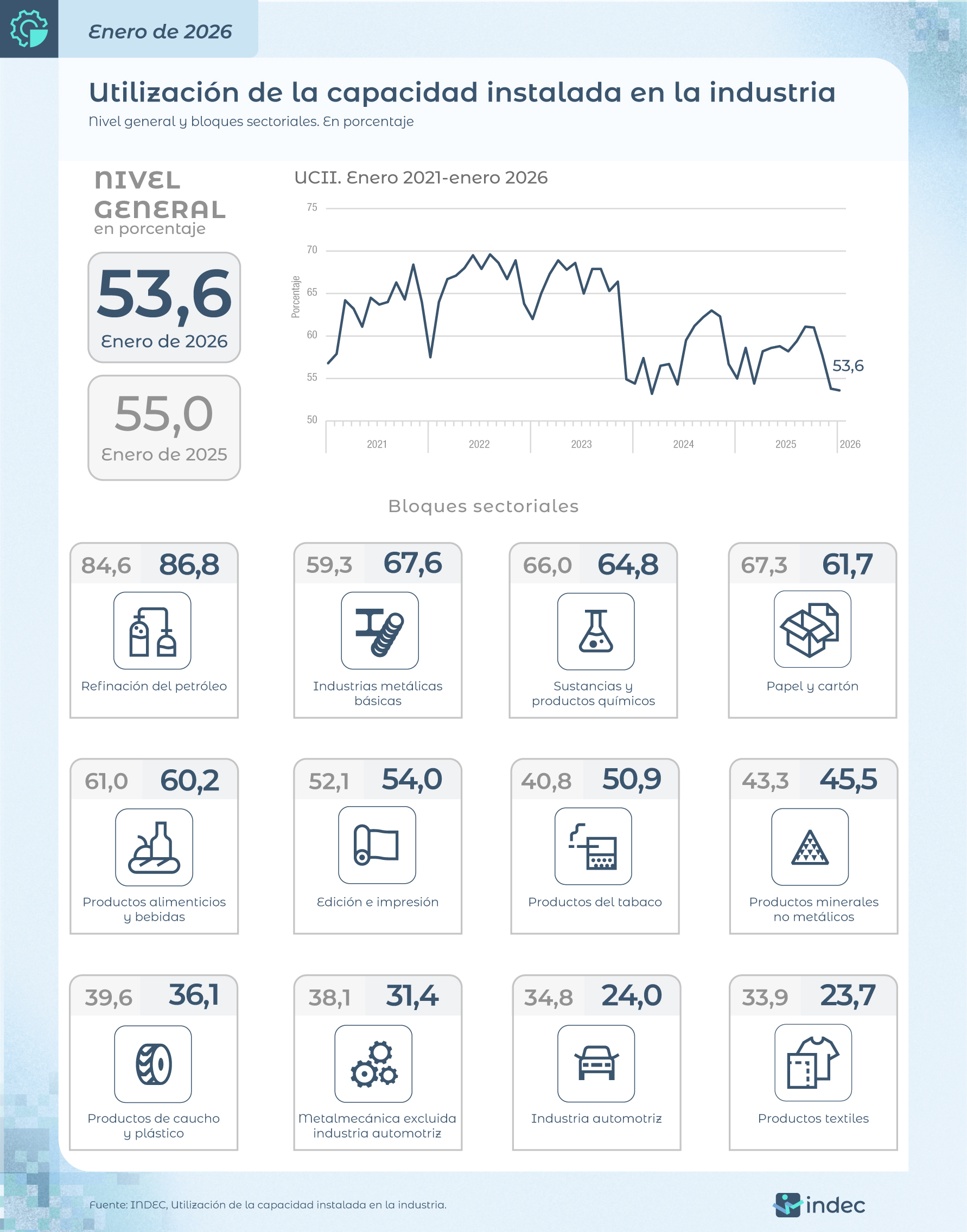 El uso de la capacidad instalada se achicó a 53,6%