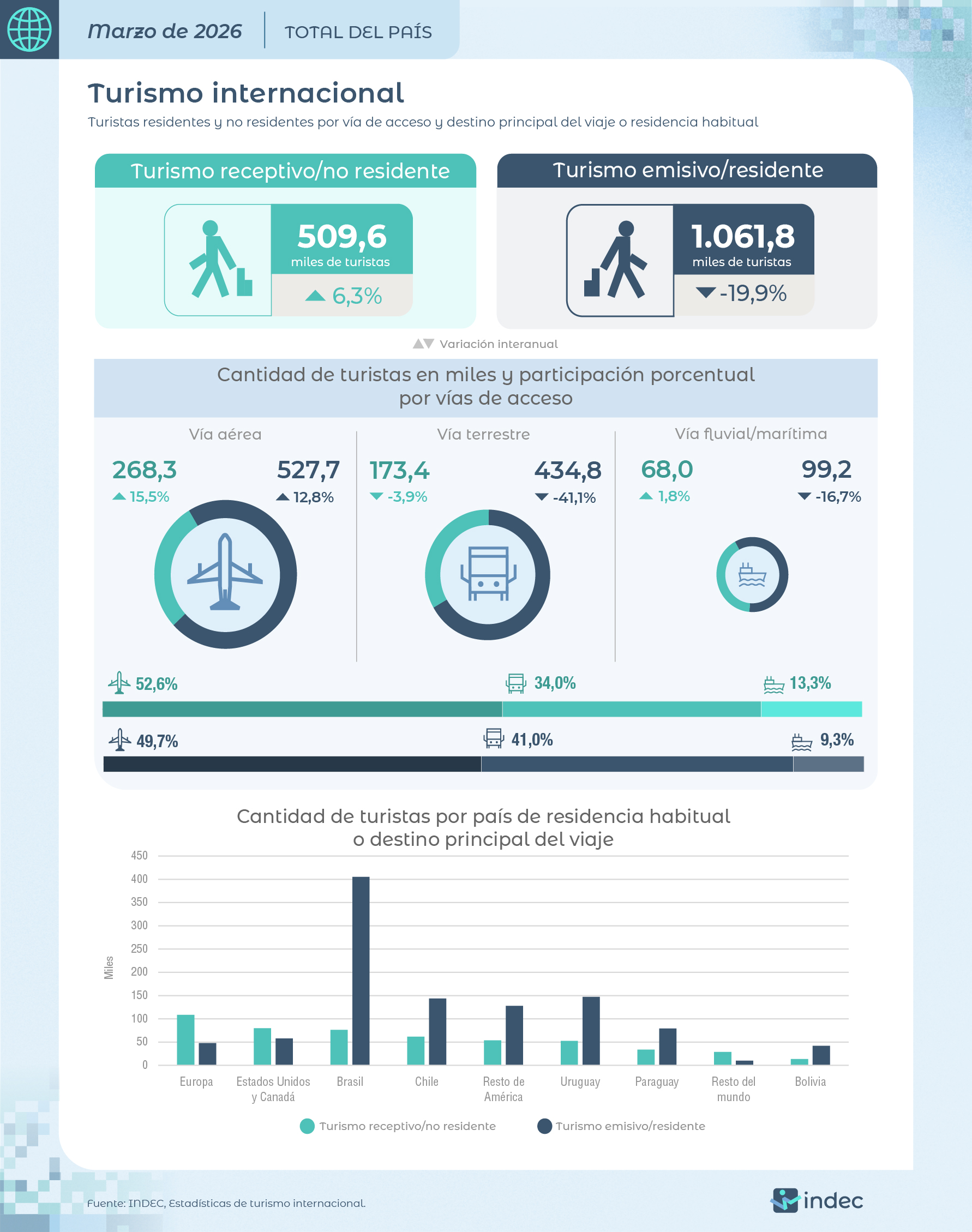 El turismo internacional creció 6,3% interanual en marzo