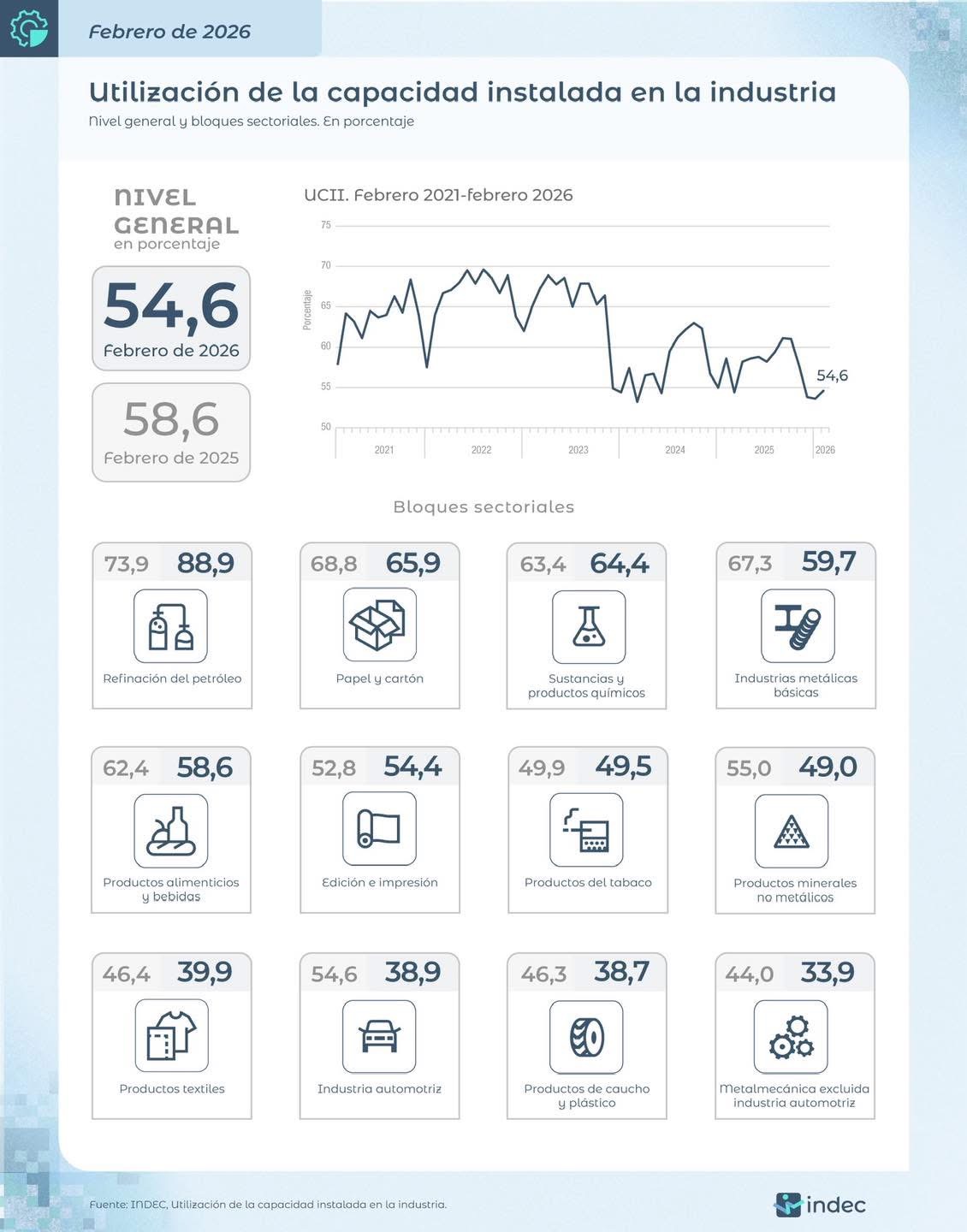 La industria utilizó el 54% de su capacidad instalada en el primer bimestre