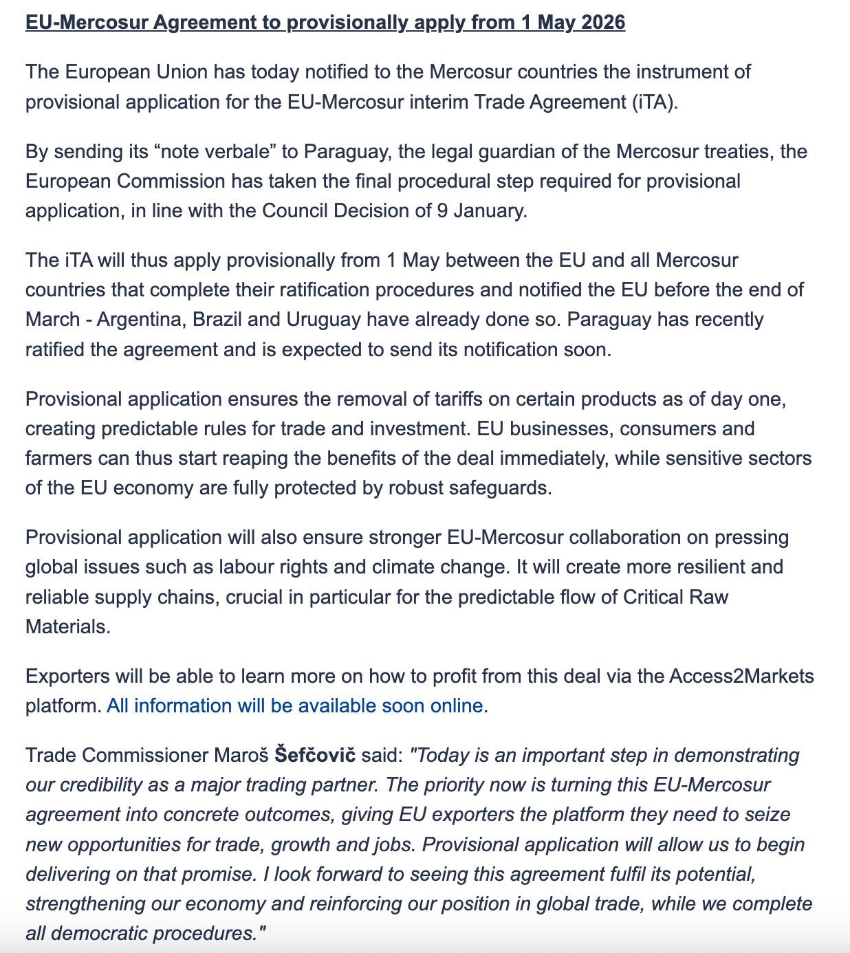 En un comunicado difundido por la Comisión Europea anunció la aplicación provisional del acuerdo, lo que incluye una eliminación de tarifas en ciertos productos desde el 1 de mayo, "creando reglas predecibles para el comercio y las inversiones", destacaron en el comunicado.