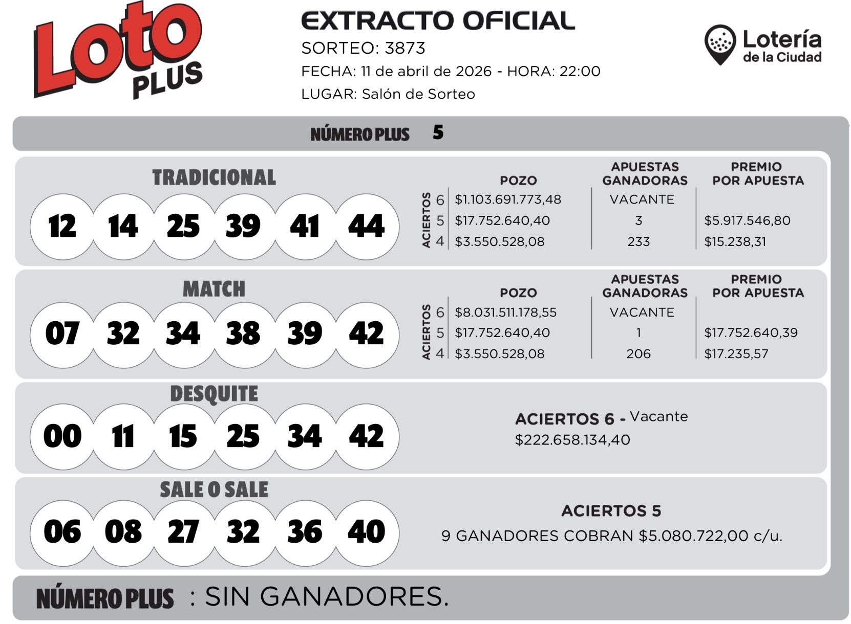 Este sábado 11 de abril en el sorteo Tradicional del Loto Plus salieron 12 - 14 - 25 - 39 - 41 - 44.