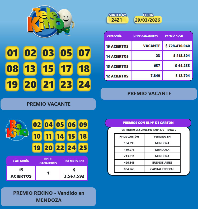 Sociedad | Este domingo, 29 de marzo, el sorteo tradicional del Telekino resultó vacante. En tanto el Rekino fue para 1 apostador.