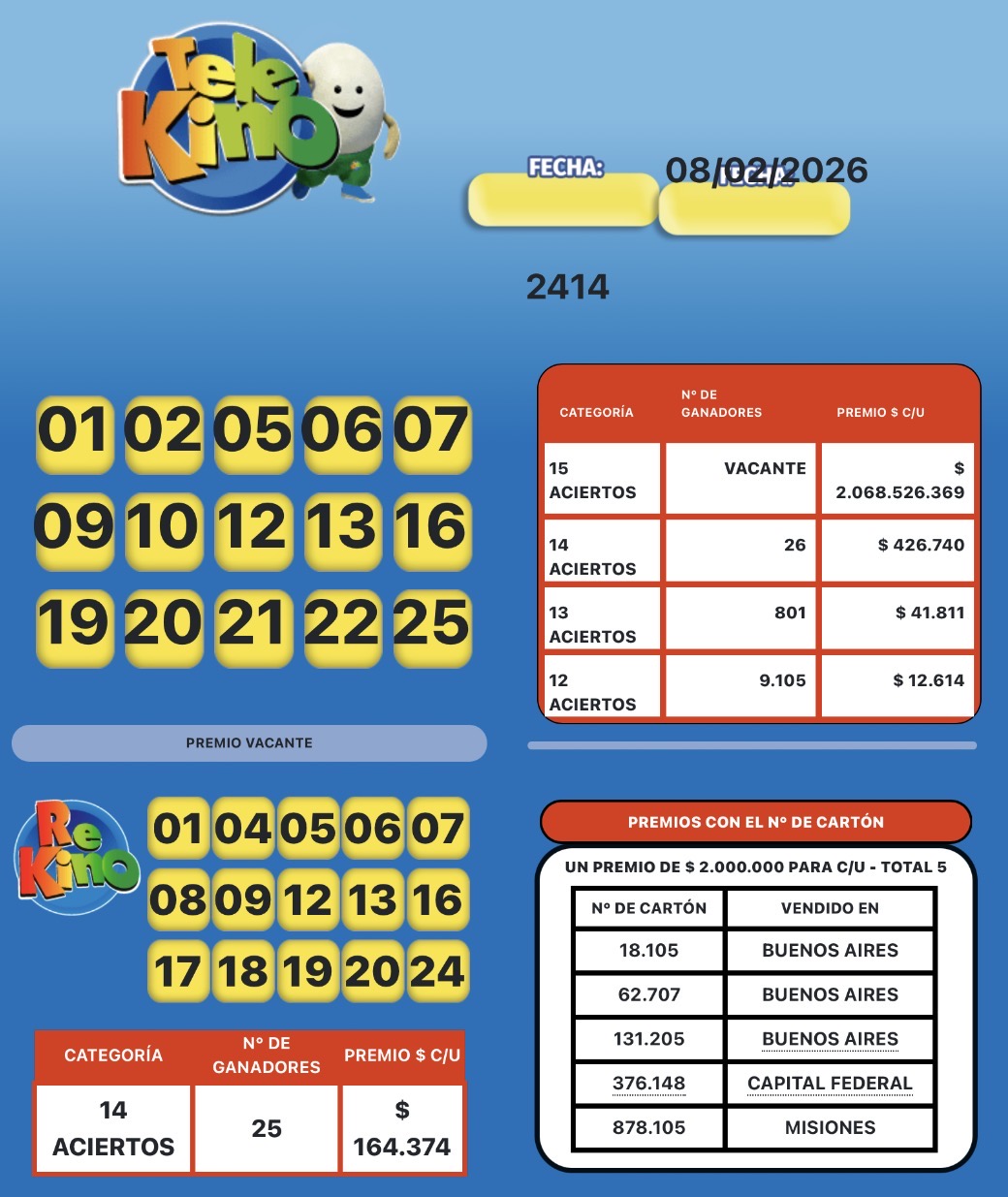 Sociedad | Aquí el resultado del sorteo 2.414 del Telekino que en su versión tradicional con un pozo de más de $2.000 millones quedó vacante, mientras que el pozo del Rekino fue para un 25 apostadores que se lleva más de $164 millones.