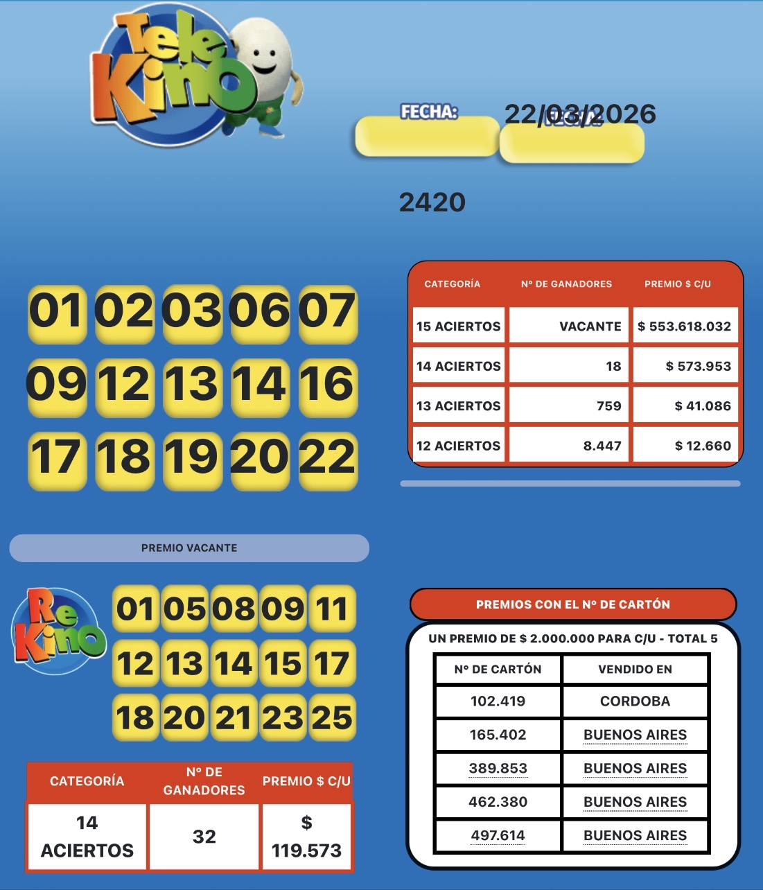Rekino: resultados del 22 de marzo para controlar cartón