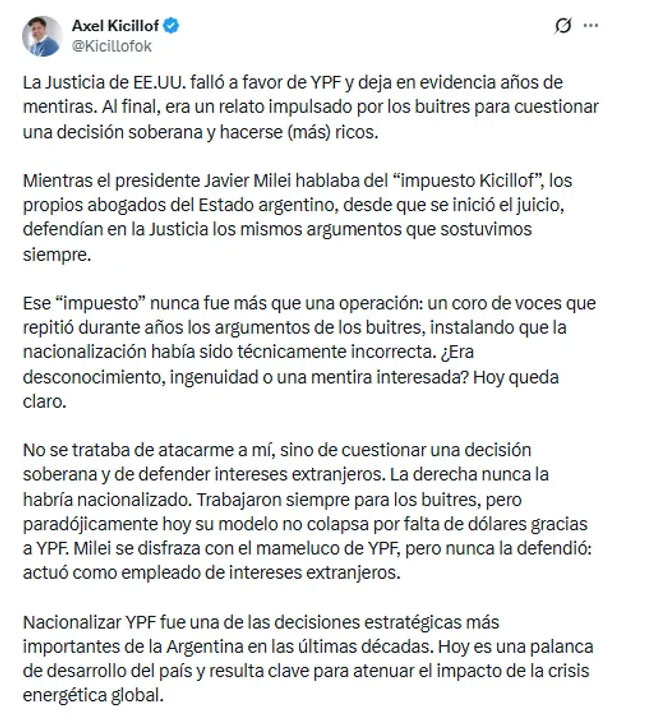 Kicillof se expresó en redes sociales tras el fallo de la Justicia estadounidense a favor de la Argentina en la causa por la expropiación de YPF y celebró la decisión de dejar sin efecto la millonaria condena contra el país. Para el mandatario provincial, “la Justicia de EE.UU. falló a favor de YPF y deja en evidencia años de mentiras. Al final, era un relato impulsado por los buitres para cuestionar una decisión soberana y hacerse (más) ricos”.