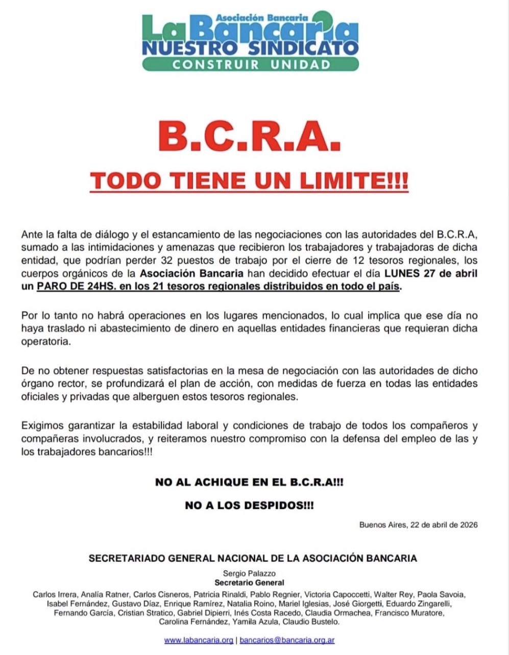Política | La Asociación Bancaria anunció un paro bancario de 24 horas para el lunes 27 de abril de 2026. Esta medida surge en medio de un conflicto con el Banco Central de la República Argentina (BCRA). El gremio rechaza el cierre de dependencias y advierte sobre el riesgo de despidos en el sector.
