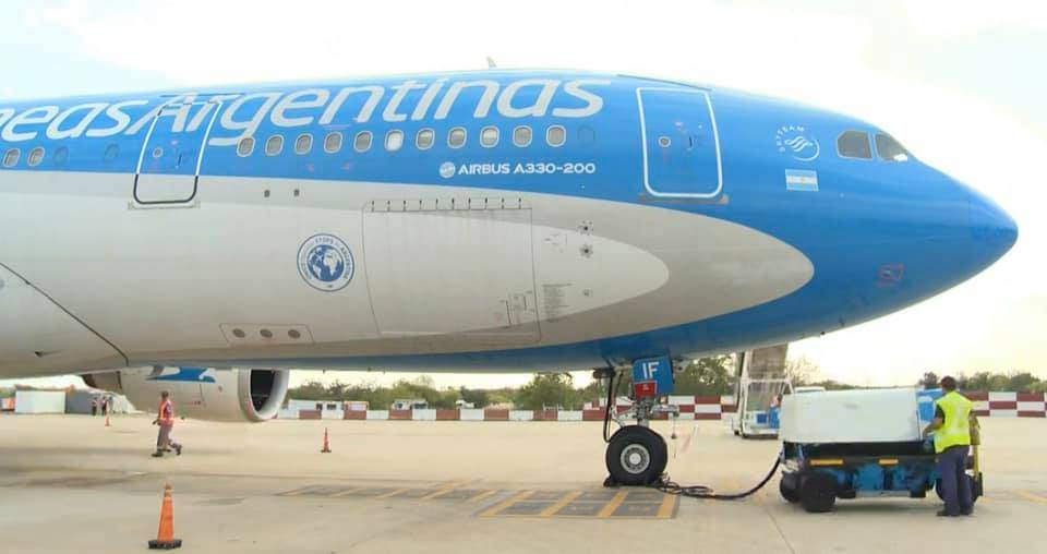 La aeronave, un Airbus 330-200 matrícula LA-GIF, especialmente preparado para el transporte de carga, bajo el número AR1063, aterrizó en Ezeiza a las 16,52, donde fue recibida por la Ministro de Salud, Carla Vizzotti; el Ministro del Interior, Wado De Pedro; la asesora presidencial, Cecilia Nicolini y el titular de Aerolíneas Argentinas, Pablo Ceriani.