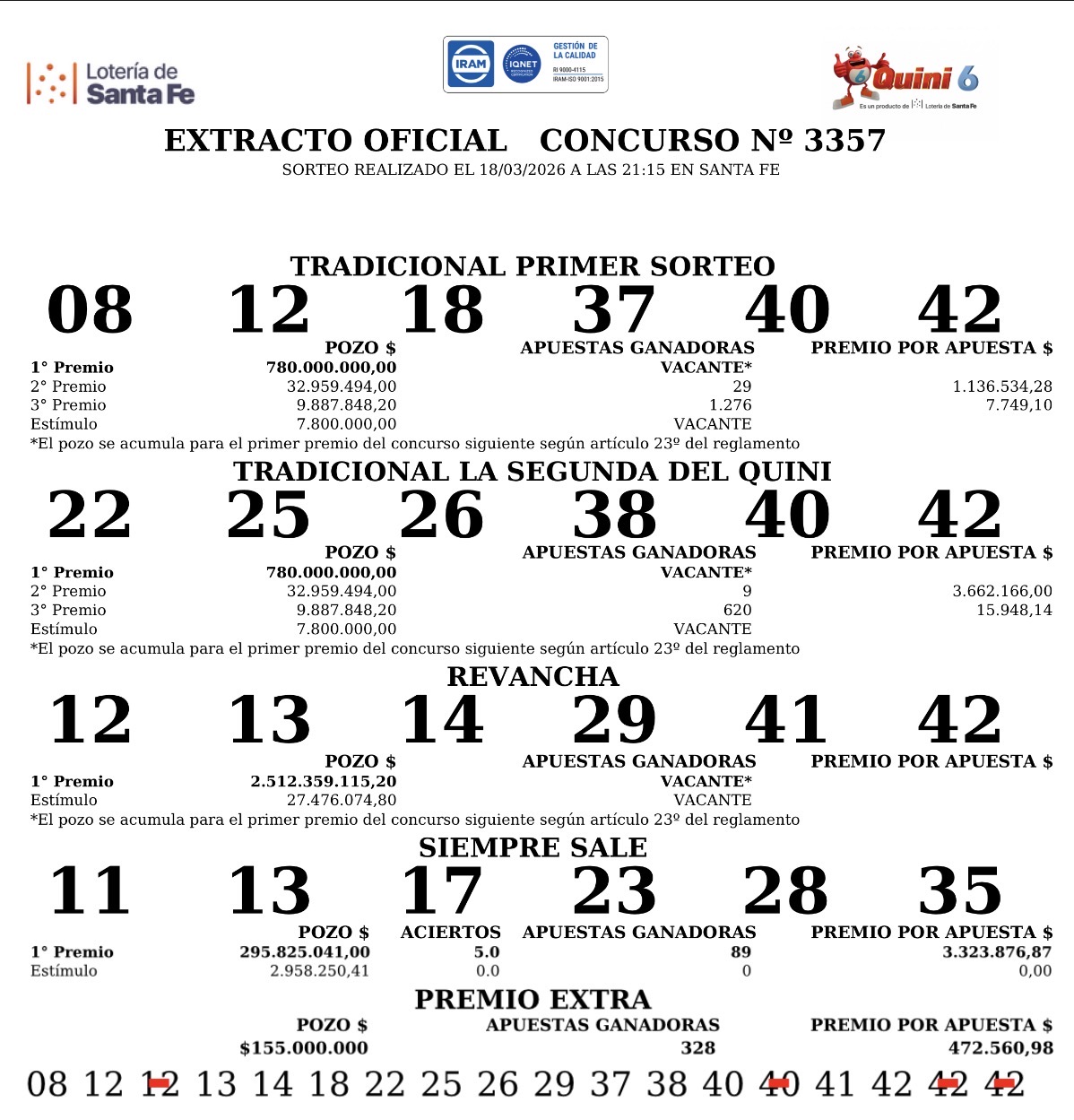 Por su parte, en La Segunda, los números favorecidos fueron 22-25-26-38-40-42. El pozo $780.000.000 quedó vacante.