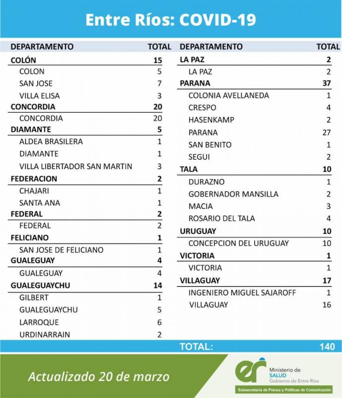 El área de Vigilancia Epidemiológica del Ministerio de Salud, confirmó que en Entre Ríos este sábado se registraron 140 nuevos casos de coronavirus. En el Departamento Uruguay 10 casos, todos de la ciudad de Concepción del Uruguay.