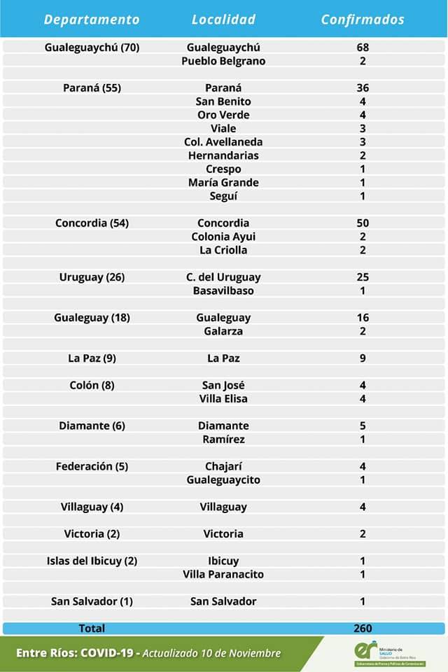Salud | El área de Vigilancia Epidemiológica del Ministerio de Salud, confirmó que en Entre Ríos este martes se registraron 260 nuevos casos. El número de infectados, desde que comenzó la pandemia, asciende a 18.783 casos.
