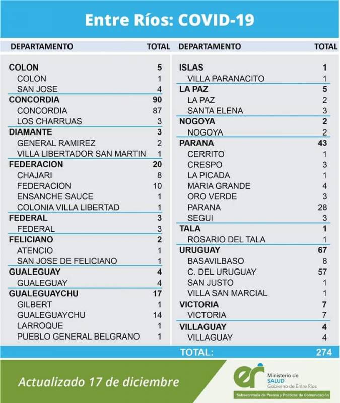 A partir de los datos reportados al 17 de diciembre de 2020 por el área de Vigilancia Epidemiológica del Ministerio de Salud, en Entre Ríos se han sumado 274 casos de Coronavirus.
