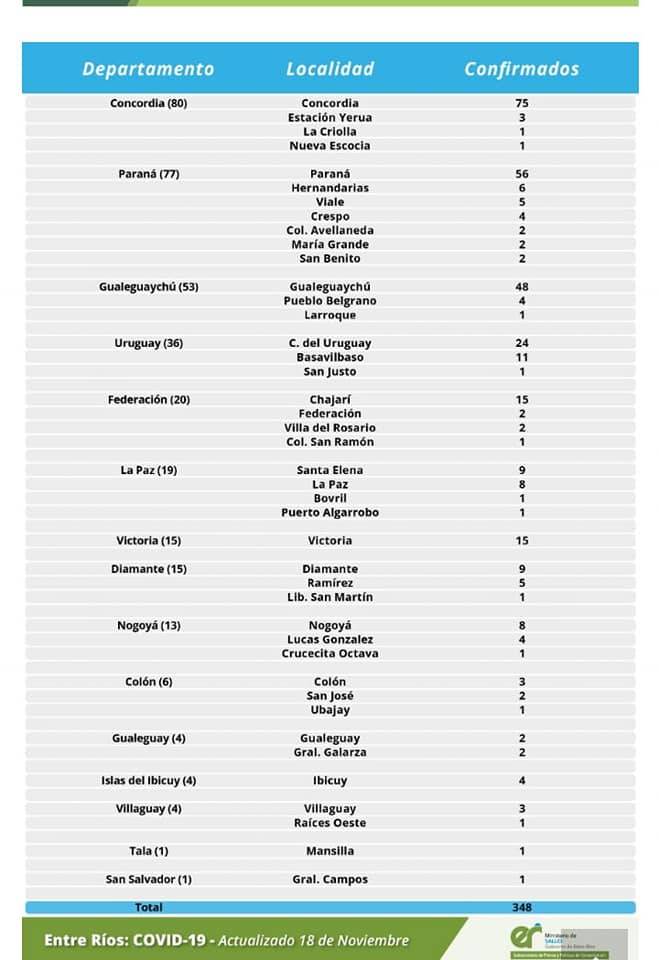 A partir de los datos reportados al 18 de noviembre de 2020 por el área de Vigilancia Epidemiológica del Ministerio de Salud, en Entre Ríos se han sumado 348 casos de coronavirus.