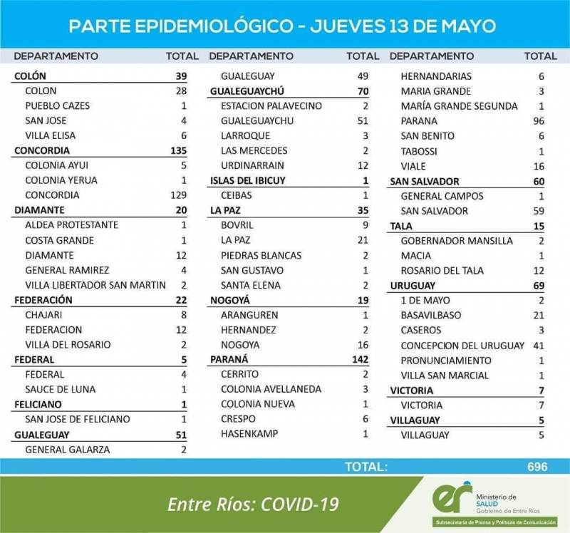 El área de Vigilancias Epidemiológica del Ministerio de Salud, confirmó que en Entre Ríos este jueves se registraron 696 nuevos casos de coronavirus.