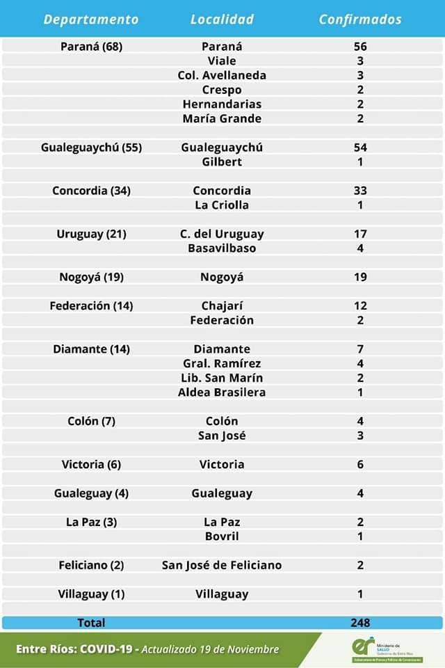 A partir de los datos reportados al 19 de noviembre de 2020 por el área de Vigilancia Epidemiológica del Ministerio de Salud, en Entre Ríos se han sumado 248 casos de coronavirus.