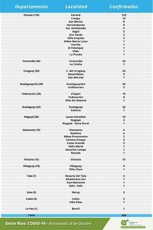 El área de Vigilancia Epidemiológica del Ministerio de Salud, confirmó que en Entre Ríos este miércoles se registraron 400 nuevos casos de coronavirus.