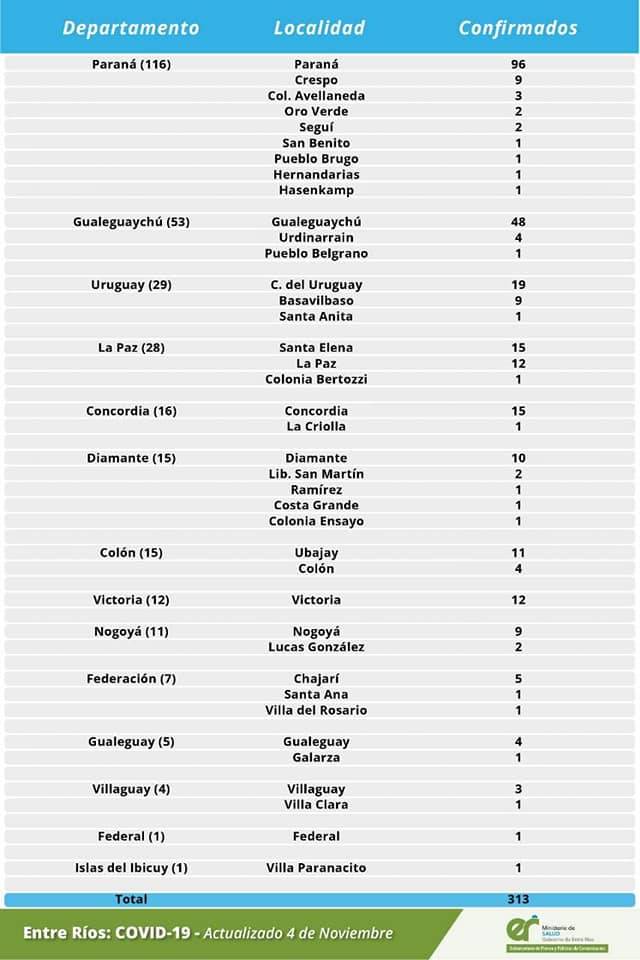 A partir de los datos reportados al 4 de noviembre de 2020 por el área de Vigilancia Epidemiológica del Ministerio de Salud, en Entre Ríos se han sumado 313 casos de coronavirus, 9 en Basavibaso y 1 en Santa Anita.
