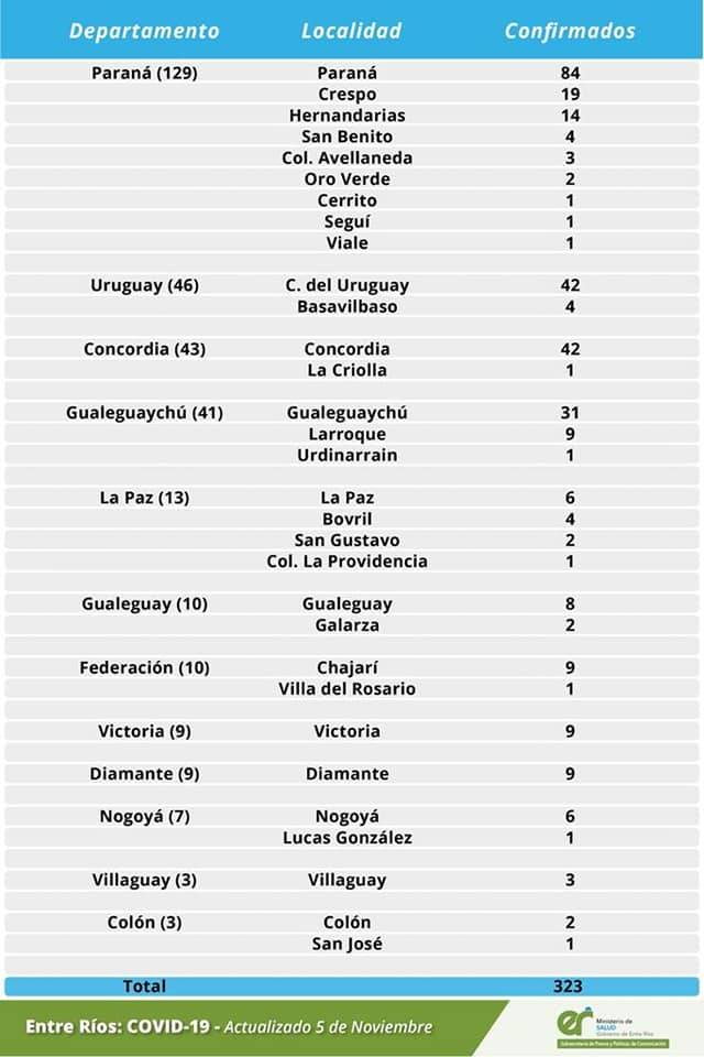 El área de Vigilancia Epidemiológica del Ministerio de Salud, confirmó que en Entre Ríos este jueves se registraron 323 nuevos casos de coronavirus.