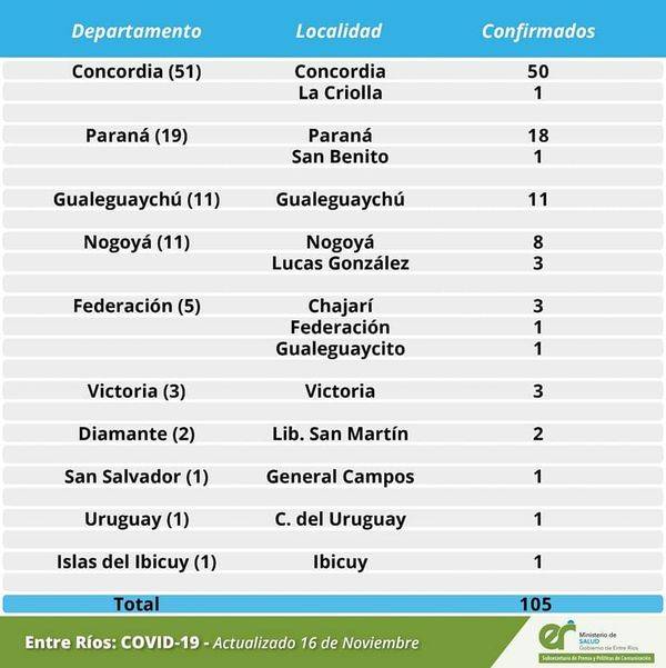 El área de Vigilancia Epidemiológica del Ministerio de Salud, confirmó que en Entre Ríos este lunes se registraron 105 nuevos casos de coronavirus.