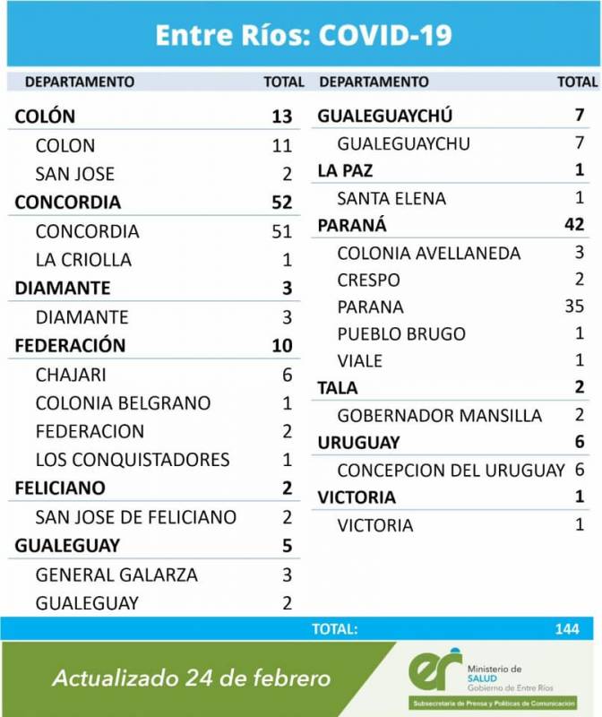 El área de Vigilancia Epidemiológica del Ministerio de Salud, confirmó que en Entre Ríos este miércoles se registraron 144 nuevos casos de coronavirus. En el Departamento Uruguay 6, todos de la ciudad de Concepción del Uruguay.