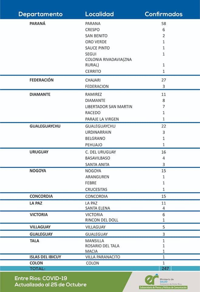 El área de Vigilancia Epidemiológica del Ministerio de Salud, confirmó que en Entre Ríos este domingo se registraron 247 nuevos casos de coronavirus.Los que se distribuyen de la siguiente manera: