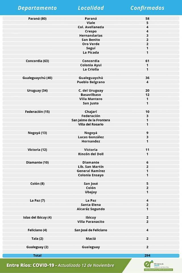A partir de los datos reportados al 12 de noviembre de 2020 por el área de Vigilancia Epidemiológica del Ministerio de Salud, en Entre Ríos se han sumado 294 casos de coronavirus. *Se restan 7 casos de la ciudad de Gualeguay ya que obedecen a pacientes en seguimiento que habían sido confirmados con anterioridad.