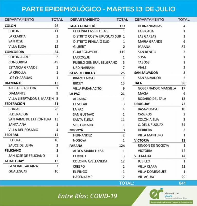 El área de Vigilancias Epidemiológica del Ministerio de Salud, confirmó que en Entre Ríos este martes se registraron 641 nuevos casos de coronavirus.