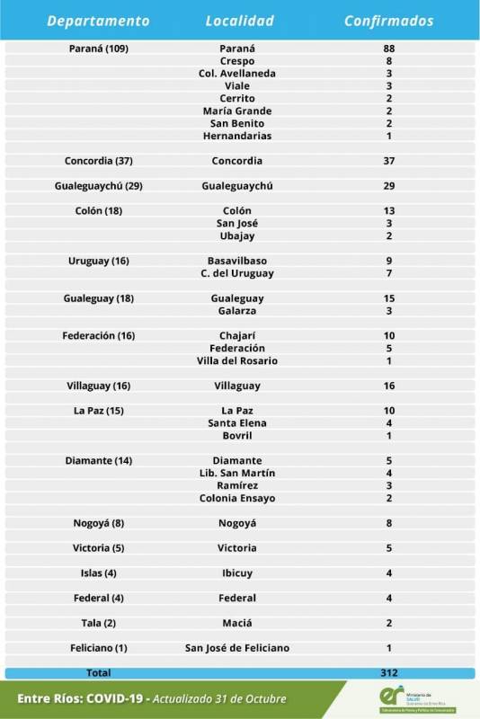 Salud | El área de Vigilancia Epidemiológica del Ministerio de Salud, confirmó que en Entre Ríos este sábado se registraron 312, de los cuales 16 son del Departamento Uruguay y 9 de Basavilbaso.