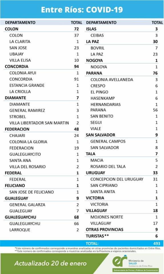 El área de Vigilancia Epidemiológica del Ministerio de Salud, confirmó que en Entre Ríos este miércoles se registraron 493 nuevos casos de coronavirus. En el Departamento Uruguay se detectaron 33 casos positivos, distribuidos en Santa Anita (1); San Cipriano (1) y Concepción del Uruguay (31).