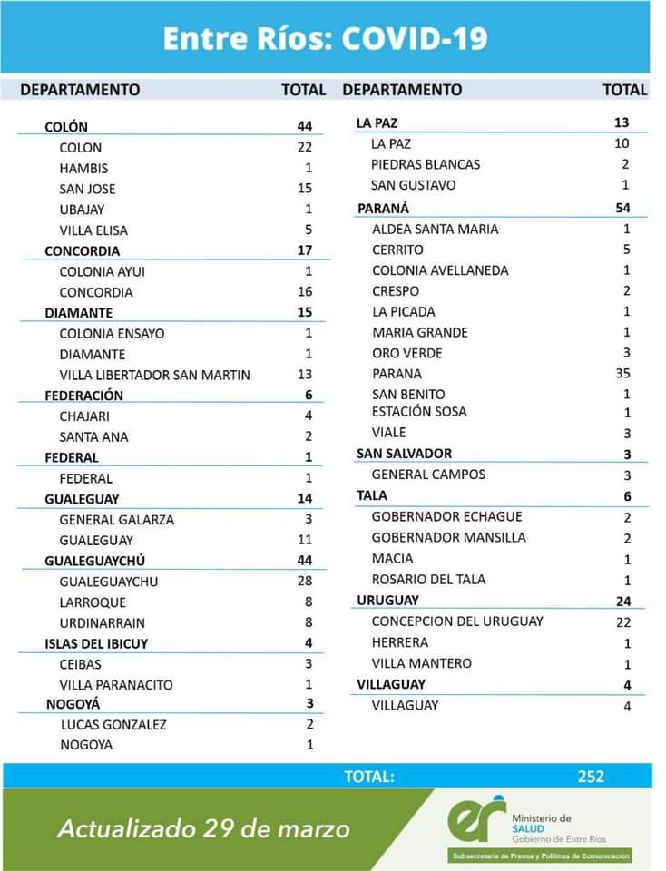 En virtud de los datos reportados al 29 de marzo de 2021 por el área de Vigilancia Epidemiológica del Ministerio de Salud, en Entre Ríos se han sumado 252 casos de coronavirus. De los cuales 24 son del Departamento Uruguay, 1 de Mantero, 1 de Herrera y 22 de Concepción del Uruguay.