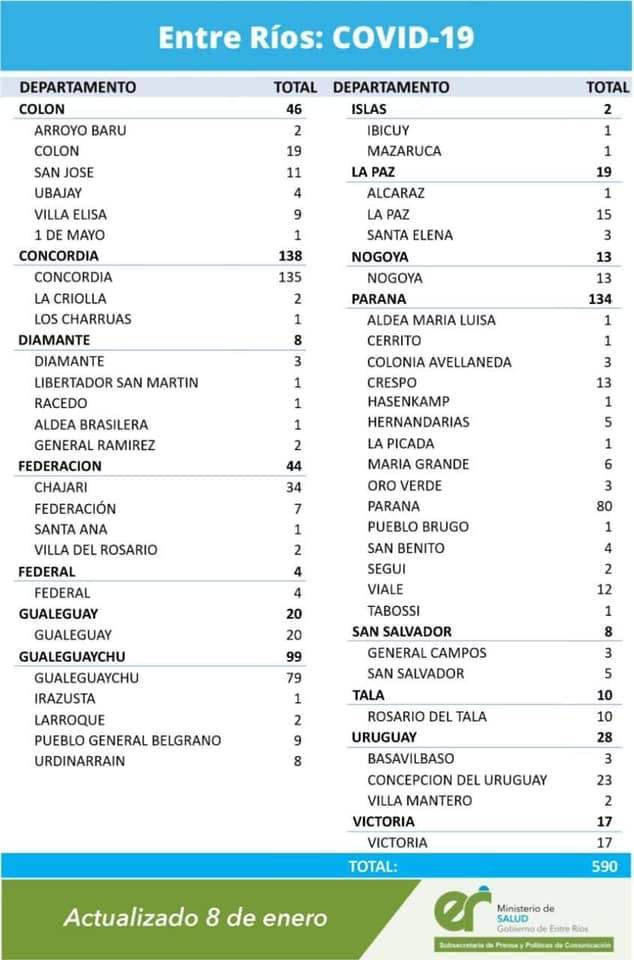En virtud de los datos reportados al 8 de enero de 2021 por el área de Vigilancia Epidemiológica del Ministerio de Salud, en Entre Ríos se han sumado 590 casos de coronavirus.