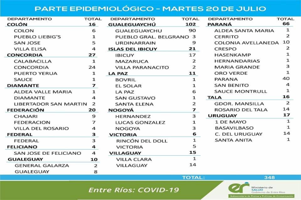 En virtud de los datos reportados por el área de Vigilancia Epidemiológica del Ministerio de Salud este martes 20 de julio, en Entre Ríos se han sumado 348 casos de coronavirus.